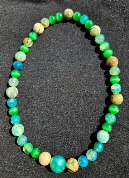 Beads are Stone and Glass strung on extremely strong elasticated.